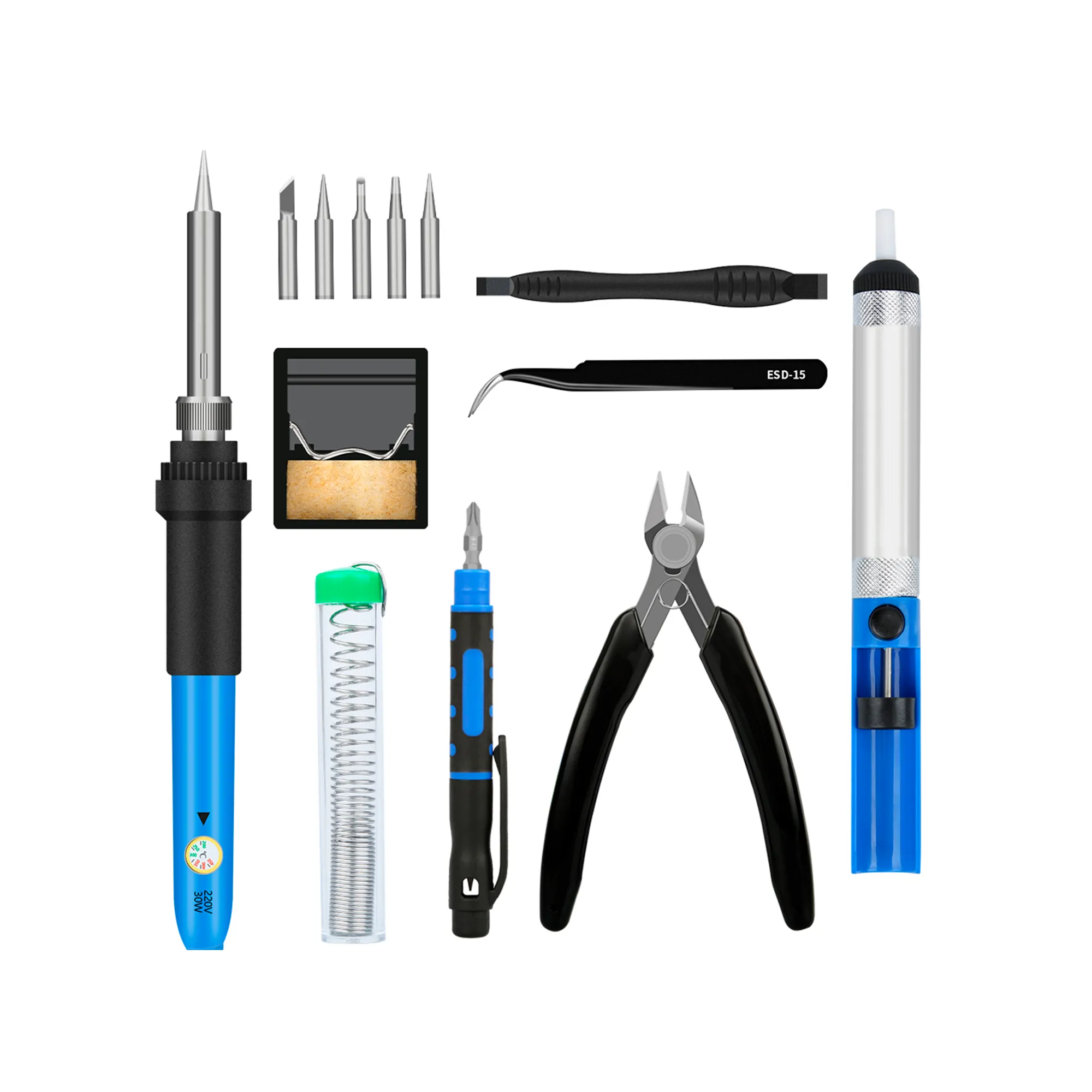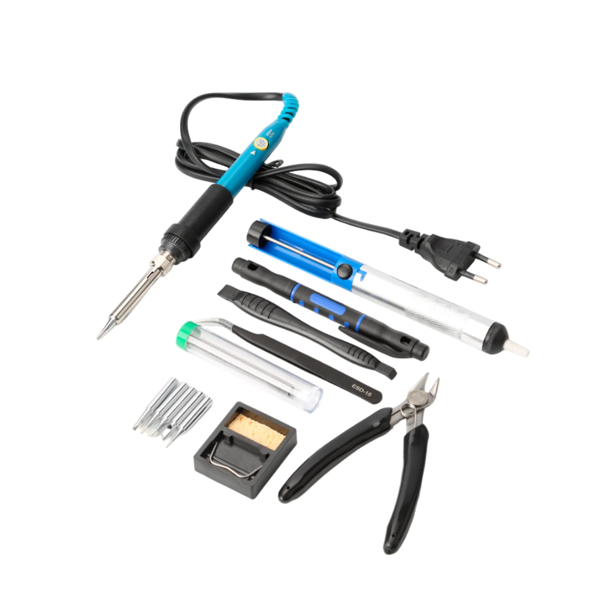 JUEGO DE SOLDADOR-60W 220V, TEMPERATURA AJUSTABLE, INCLUYE: SOLDADOR, 5 PUNTAS, ALAMBRE, BOMBA PARA DESOLDAR, PALANCA, PINZA, ALICATE, DESTORNILLADOR, SOPORTE.